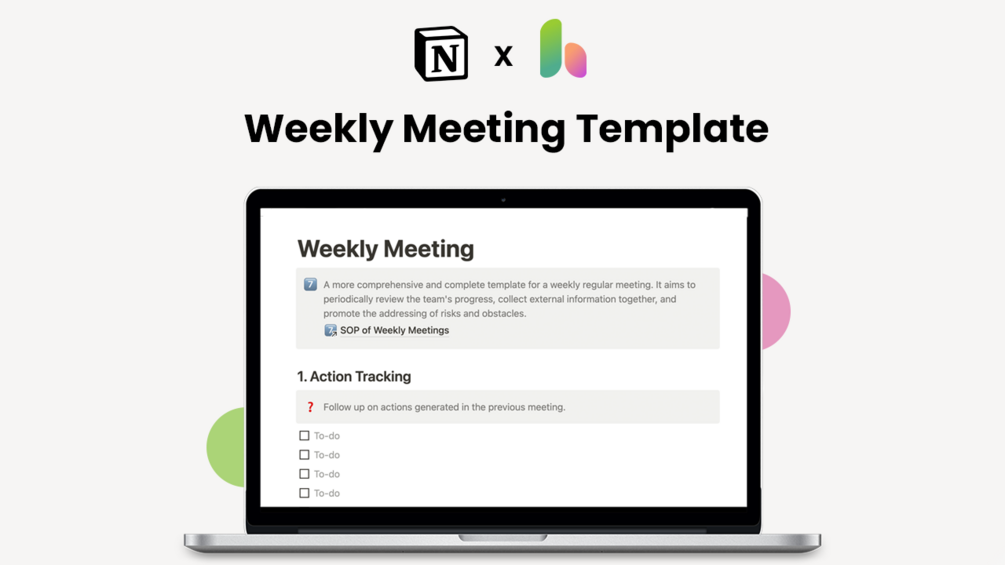 After purchase you'll get access to the Notion template immediately. From the template page, click on Duplicate link (top right-hand of screen) to copy to your account. For ongoing use, delete the sample content then click on Duplicate again to copy & rename for each meeting.